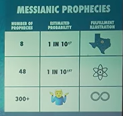 1. The Messiah will be born in Bethlehem (Micah 5:2). The average population of Bethlehem from the time of Micah to the present (1958) divided by the average population of the earth during the same period = 7,150/2,000,000,000 or 2.8×105.