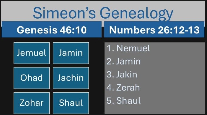 It's easy to dismiss the genealogies in the Bible as mere lists of names, but they offer an opportunity to excavate revelatory nuggets from the sacred texts. Take the tribe of Simeon, for instance. In Numbers 26:12-13, the sons are listed as Nemuel, Jamin, Jakin, Zerah, and Shaul. However, Genesis 46:10 provides a different lineup: Jemuel, Jamin, Ohad, Jachin, Zohar, and Shaul. In Numbers, we see Nemuel instead of Jemuel. The Numbers list has Zerah, but no Ohad or Zohar. Even the total number of sons differs—five versus six. How can we explain these inconsistencies?