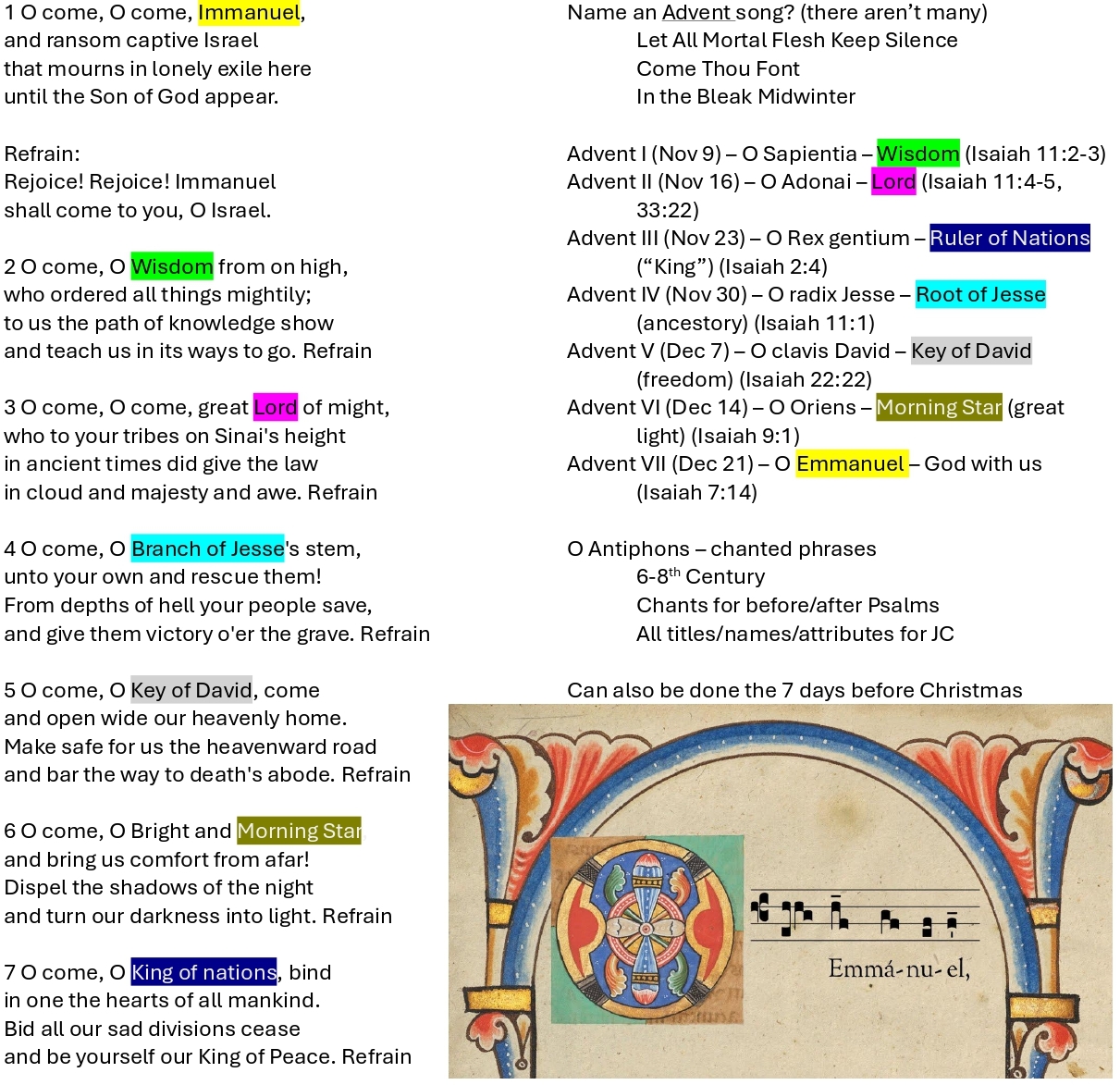 The Christmas hymn/carol, O Come, O Come Emmanuel, is based on the seven antiphons of a 7-week Advent season (or in some cases, the seven days leading up to Christmas Day). We used the summary below for a Family Dinner (our Shabbat) topic.