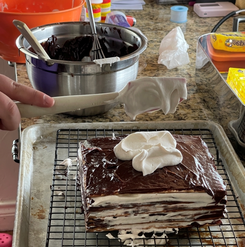Matteo made a Matzah Cake (layer 8x: matzah | chocolate | whipped cream)