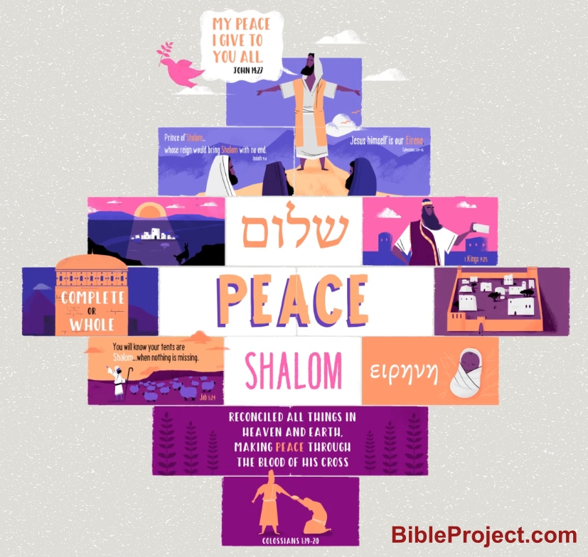 The word for peace in Biblical Hebrew is shalom (שָׁלוֹם). More than what we think of as peace (i.e. absence of conflict, restful, etc.), shalom's bigger meaning is completeness or wholesness. Watch this video from The Bible Project.