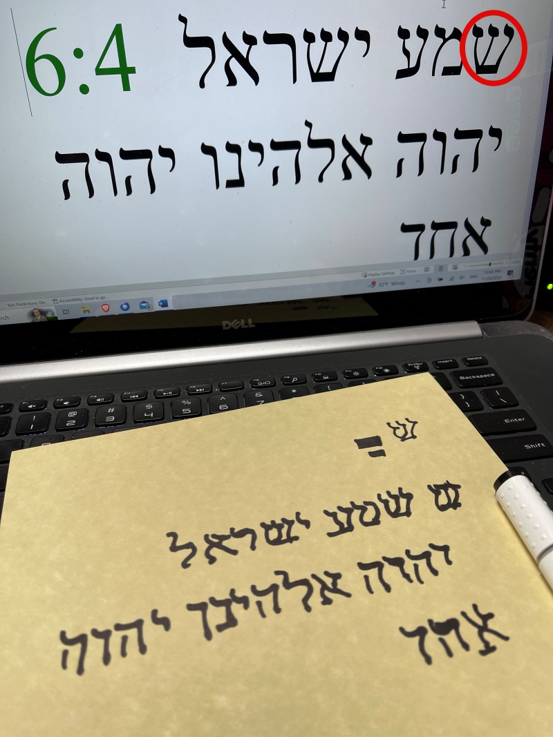 Pictured at right is one of my attempts at writing a very small portion of the text myself to put in the Mezuzah case. The text is "Hear, O Israel: The Lord our God, the Lord is one." (Deuteronomy 6:4)
